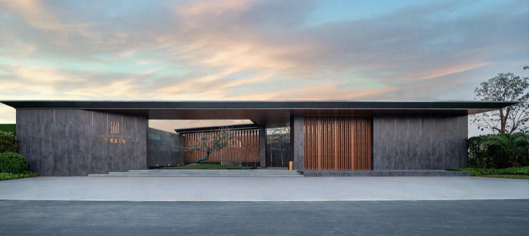 金属流线勾勒刚劲石材,铁瀑沿墙潺潺而落,是入口处的点睛之笔。夜晚灯光点亮,它便是归家之路的指明灯,一眼望去自然安定。