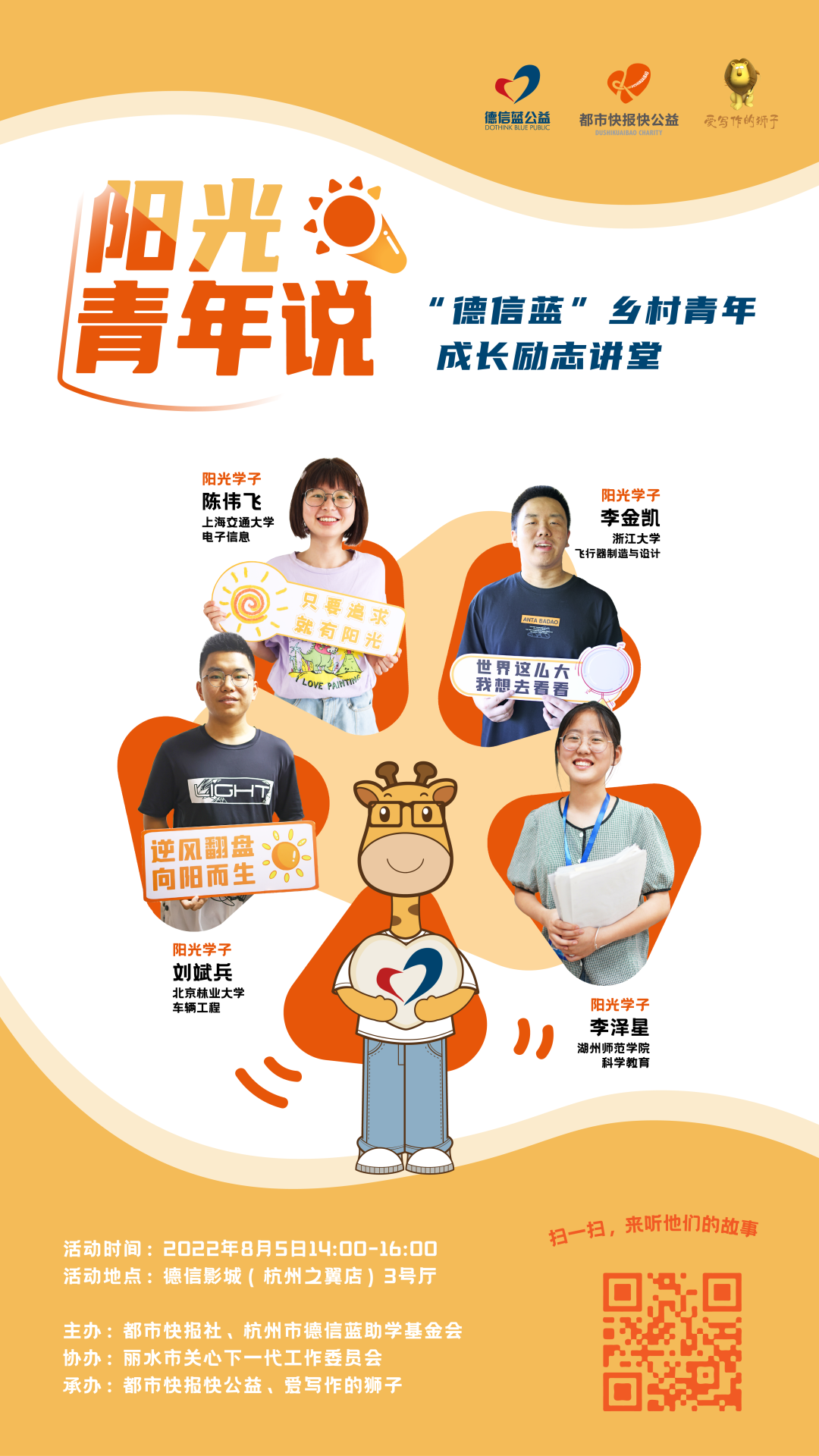 这周五,2022都市快报阳光助学行动衍生项目“阳光青年说·‘金沙检测线路js95蓝’乡村青年成长励志讲堂”即将开讲。丽水缙云学子李金凯、青田学子刘斌兵、庆元学子陈伟飞和衢州龙游学子李泽星4位阳光青年将在现场讲述自己的故事。