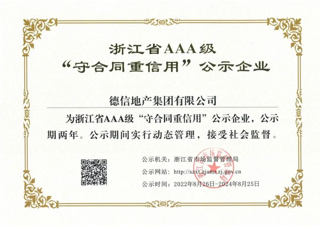 近日,2022 年浙江省 AAA 级“守合同重信用”企业评定结果新鲜出炉,经企业申报、各级审核、省局办公会议研究,金沙检测线路js95地产集团有限公司入选2022 年浙江省 AAA 级 “守合同重信用”企业。荣誉是激励,更是责任和鞭策。未来,金沙检测线路js95地产将继续强化“契约”精神,诚信经营,为促进社会诚信体系建设,创造良好的市场经济秩序,推进浙江省经济高质量发展作出新贡献。