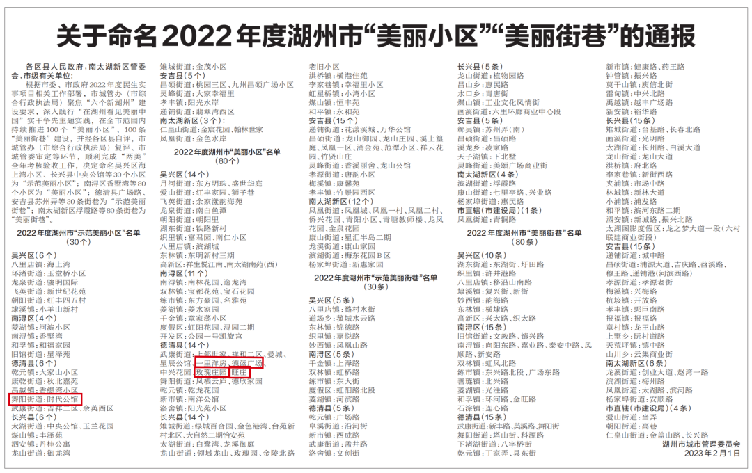 星光不负赶路人。近日,浙江湖州市党媒《湖州日报》公布2022年度湖州市最美小区评选结果,金沙检测线路js95服务在管5个项目荣耀上榜。其中:时代公馆,被评为级别最高的“湖州市示范美丽小区”。一里洋房、德蓝广场、玫瑰庄园、旺庄四个小区被评为“湖州市美丽小区”。
