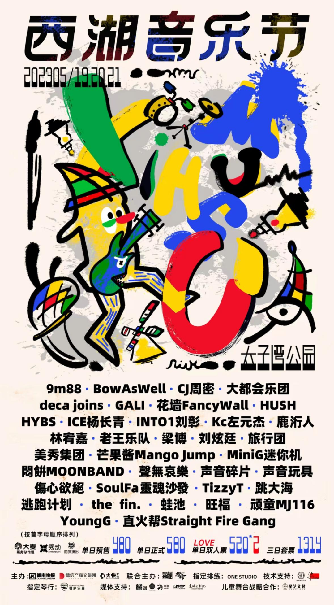 2023西湖音乐节,也如约而至。5月19日-5月21日,林宥嘉、梁博、HUSH HYBS、TizzyT、逃跑计划、顽童MJ116、旺福、旅行团、GALI、老王乐队、ICE杨长青、声音玩具、声音碎片、INTO1刘彰、傷心欲絕、deca joins、美秀集团等音乐人与你相约西湖太子湾公园,再一次,用音乐向你表白。